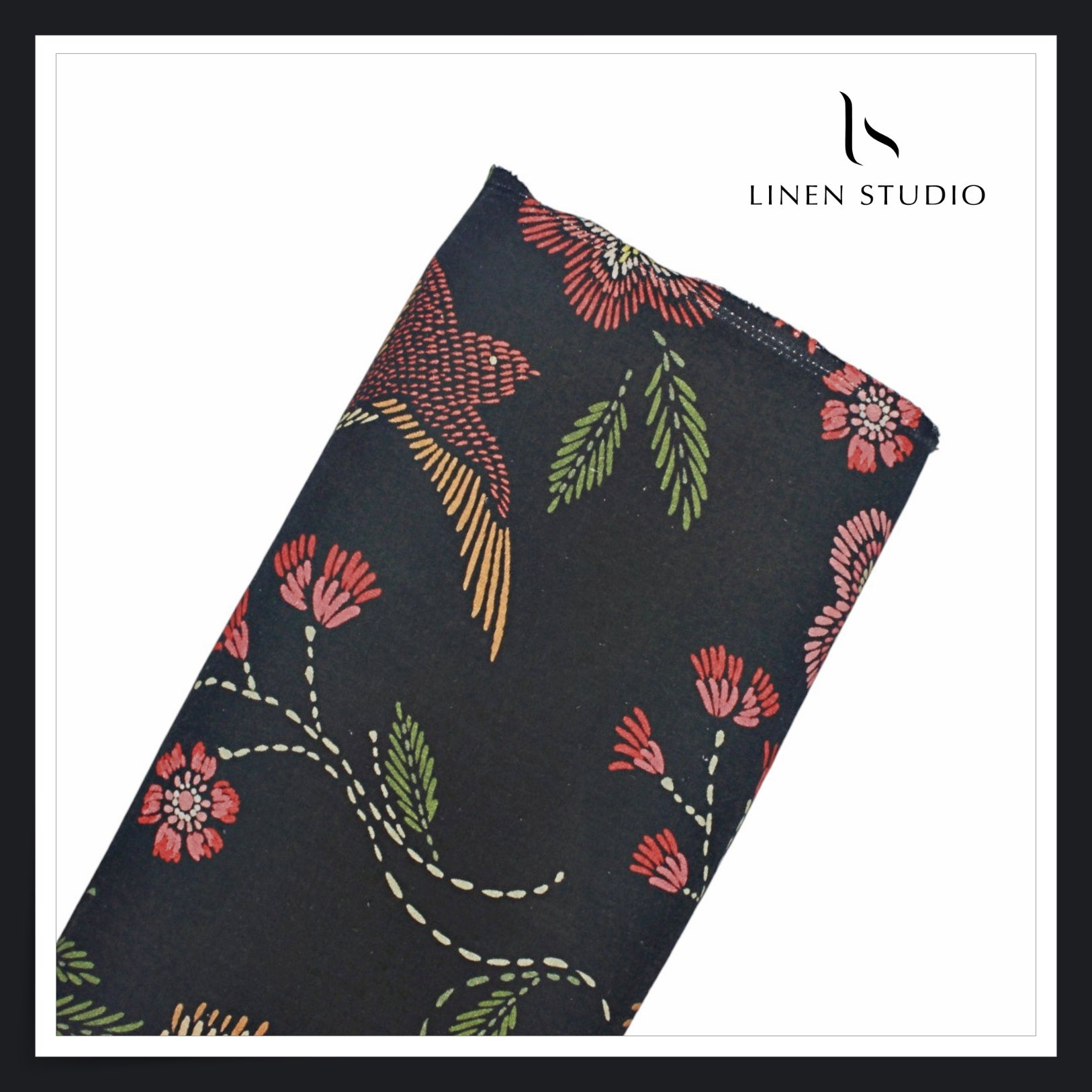 100% Pure Linen Digitally Printed by LINEN STUDIO - Black Flora & Bird (NEW) (Exclusive)