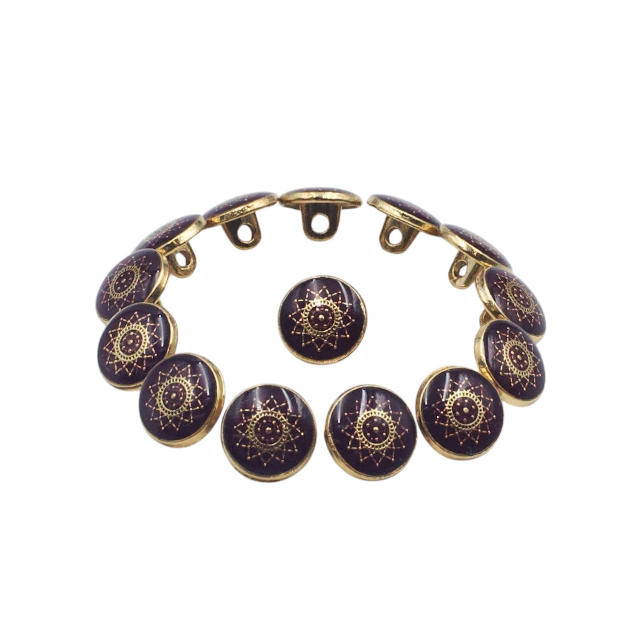 - These shiny gold with maroon enamel downhole buttons are crafted from a metal alloy for the strongest & most durable buttons, have a shank back attachment & have a shiny gold engraved design on a maroon base surface finish. These classics are mainly used for decoration on the garment to portray classical designs & modern aesthetics.